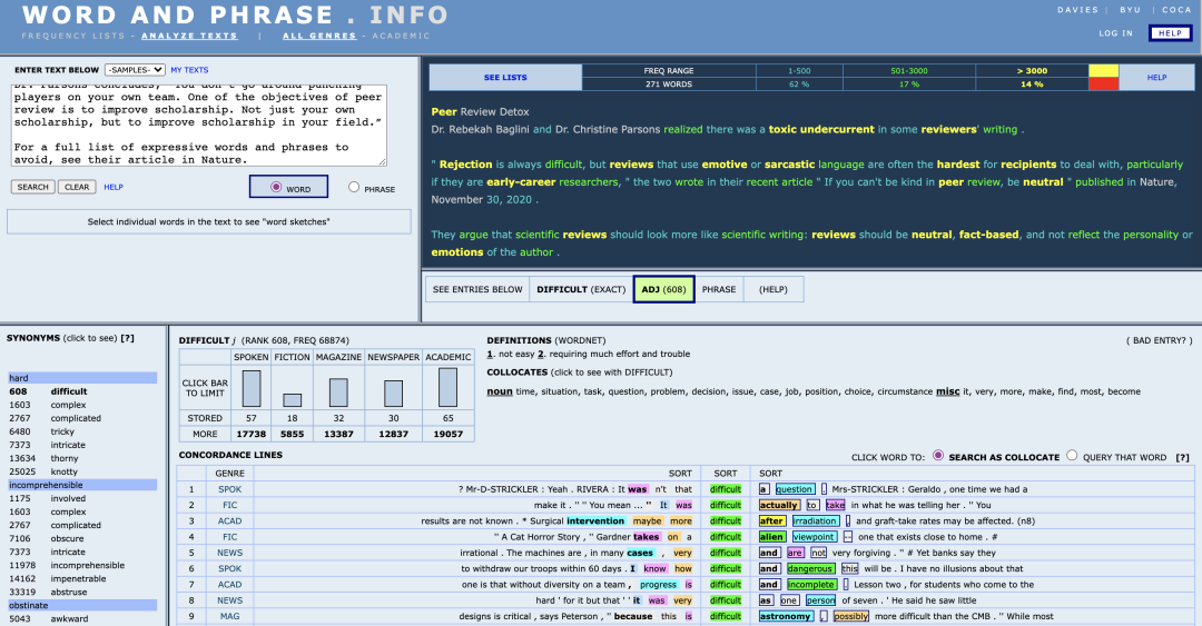 你可以在左边的表格中输入任何你想输入的文本--例如你写的一篇essay,或者你从其他网站复制的一篇paper。输入文本后,你可以看到有关该文本中的单词和短语的有用信息,这些信息是基于当代美国英语语料库(COCA)的数据。